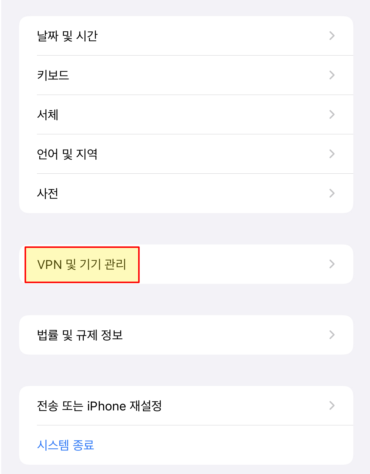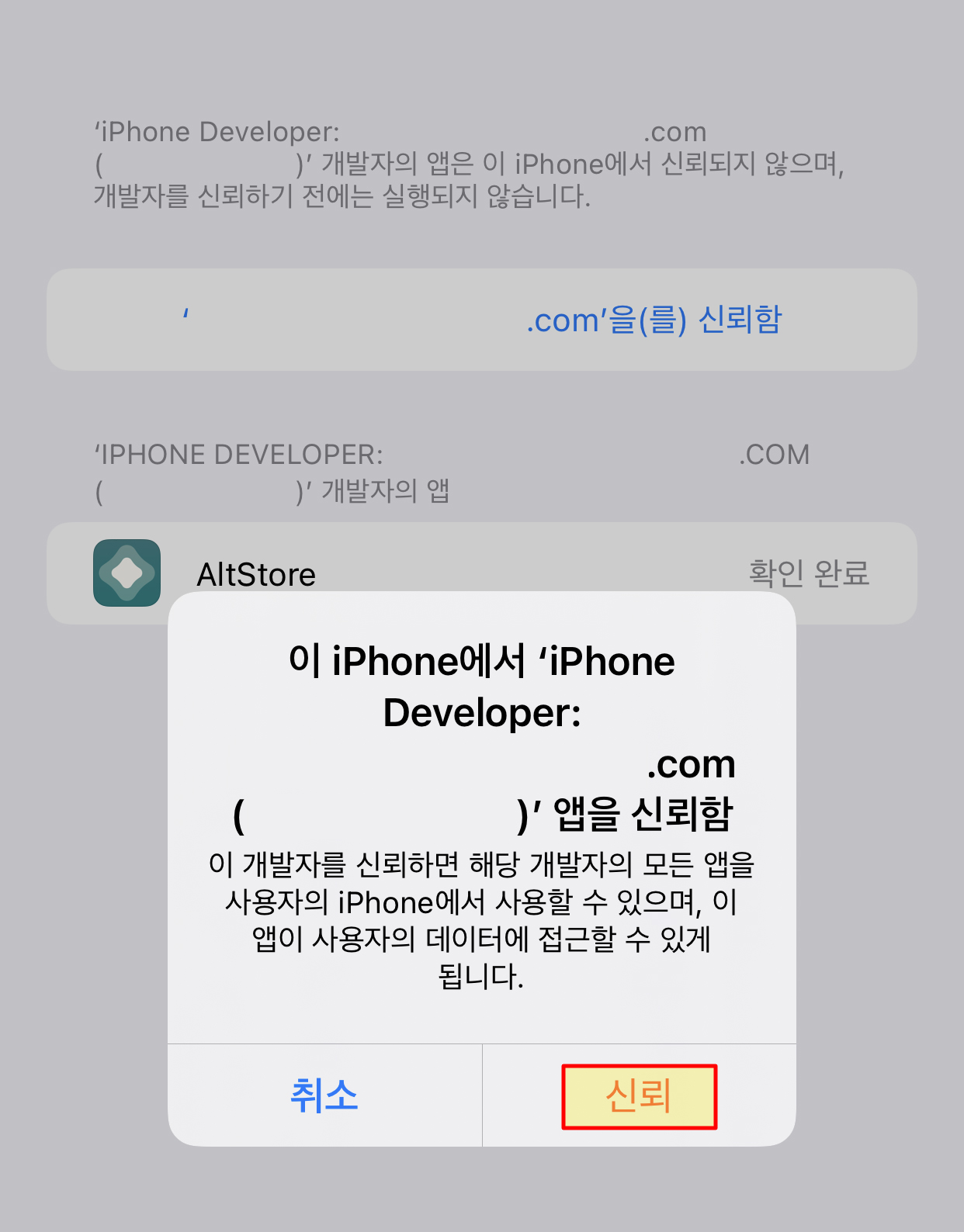 설정 > 일반 > VPN 및 기기관리 > 'e-mail을 신뢰함' > 신뢰