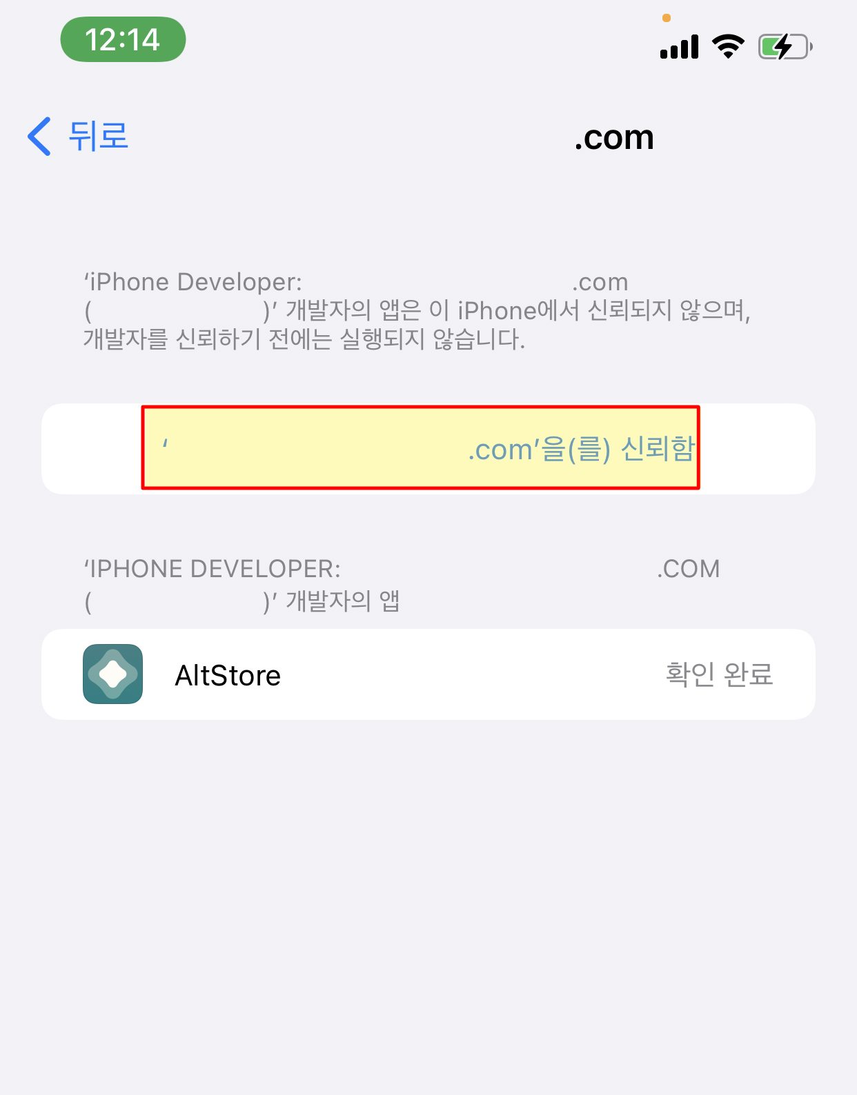아래의 사진 표시된 곳을 탭해 개발자 계정 신뢰를 해줍니다!